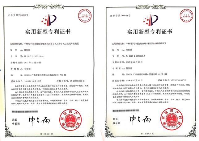 值得一提的是湛江市金順糧食機械制造有限公司通過iSo9001體系已獲得多個專利,其中有外觀專利(多功能碾米機);實用專利(一種多功能組合碾米機、一種用于多功能組合碾米機的去石機與礱谷機以及提升機裝置、一種用于多功能組合碾米機的混合糠粉碎裝置、一種用于多功能組合碾米機的電控與風機裝置、一種用于多功能組合碾米機的比重篩和碾米機裝置);發(fā)明專利(湛江碾米機、符氏ZJF-15-40M&S型號組合碾米機)等。