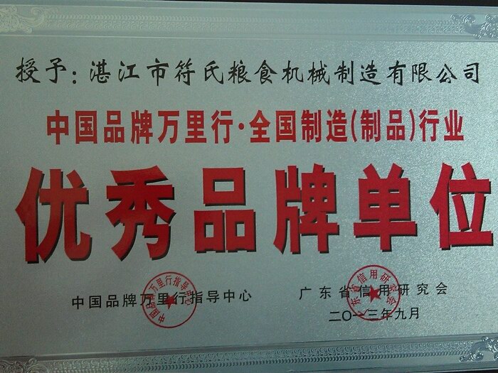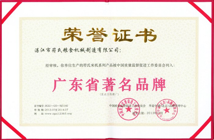 2  2013年被授予“符氏米機(jī)系列產(chǎn)品被中國質(zhì)量監(jiān)督促進(jìn)工作委員會列入:廣東省著名品牌”榮譽(yù)證書